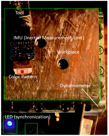 The data of the different sensors and the camera were merged and analyzed using LabVIEW® software code. The tool position data were acquired in real time out of the camera video stream using the software function “color pattern matching”. Figure 4 shows the camera view during a measurement.