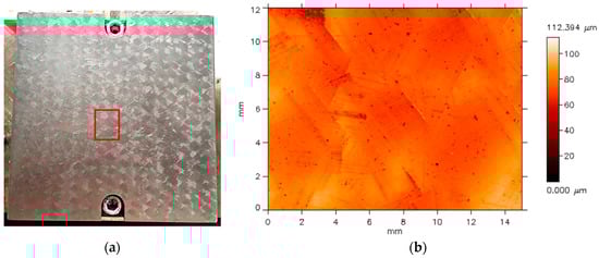 The following results show the first scraping cut of the workpiece. A photograph of the surface after scraping is shown in Figure 5a. It shows the typical visual appearance of scraped surfaces. A section of the workpiece was measured by a 3D profilometer. The results are depicted in Figure 4b.