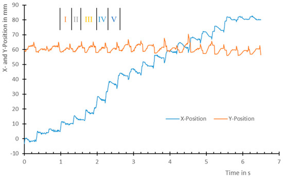 Tool movement in the X- and Y-direction during one line of scraping strokes is depicted in Figure 6. The worker chose to use 20 strokes over the 100 mm. Working with a direction angle δ of approximately 30° scraped parallel to the X-axis effected that all strokes were positioned on roughly the same Y-position while moving over the workpiece in X-direction. The scraping strokes were executed at a rate of approximately 3.1 Hz.