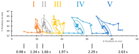 The movement patterns of five consecutive scraping cycles (roman numerals I–V) marked in the chart of Figure 6 are shown in an X–Y chart in Figure 7. This method allows one to comprehend the actual movement of the tool. The distance between two data points always represents 0.01 s. The scraping strokes as the cutting parts within the cycles are encircled. The diagram reveals that scraping cycles are sometimes executed in a circular manner (I, II) and sometimes without crossing their own paths (III–V). The directional angle δ is reasonably constant, while the length of the strokes varies significantly, as does the feed between two strokes. It can be observed that the tool is being moved in a constant direction even after the stroke, before it is directed to the location of the next stroke. This scraping pattern differs considerably from the kisage scraping process described by Fuji et al. [10].