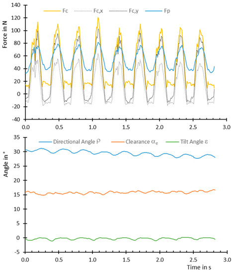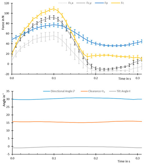 Analogous to Figure 8, average values over 30 scraping cycles are shown in Figure 9. The course of the average cutting force FC and the passive force FP, and specifically the low values of the standard deviations, show a remarkably good repeatability for a manual manufacturing process. The standard deviations of the orientation angles all had values below one degree and thus were not indicated in the diagram. Remarkably, the cyclic effects of the orientation angles almost disappear in the average values.