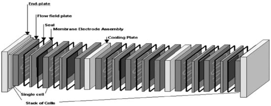 One type of fuel cell utilised in automotive vehicles is known as the proton exchange membrane fuel cell (PEMFC). This is widely regarded as the most promising for light-duty transportation [32,35], as according to [35], PEMFCs systems have a higher power density and lower operation temperature. In PEMFCs, a solid polymer is used as an electrolyte and porous carbon electrodes are also utilised as an electrolyte, [31], as shown in Figure 2. PEMFCs are normally fuelled with pure hydrogen supplied from storage tanks. The reaction in the fuel cell produces water heat and electricity as outputs [34].