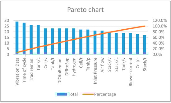 Table 3 gives a compilation of the data gathered from the respondents as it relates to the questions asked. It can be seen in Table 3 that there is no uniformity in terms of the variables needed to remanufacture fuel cells. This comes as no surprise, perhaps, as remanufacturing has been affirmed in literature to have no singular definition [12] due to, among other things, complexities arising from manufacturers’ internal process challenges and challenges outside the manufacturers’ borders, Hammond et al. (1996) [43] and Lundmark et al. (2009) [79]. (‘Manufacturers’ include both OEM and third-party remanufacturers). Secondly, variables that affect fuel cell remanufacturing can be grouped into three categories: (i) variables from FC stack; (ii) variables required for traditional remanufacturing; and (iii) variables relating to location of OEM, third-party remanufacturers and sustainability of the process. Thirdly, while sensors produce useful information to enable remanufacturing of fuels, expertise from traditional remanufacturing is also needed. Hence, effective remanufacturing of FCs is a collaborative effort. A Pareto analysis and chart was used to rank these variables in order to understand the most important parameters required for remanufacturing FCs. The Pareto principle [80] states that in any population that contributes to a common effect, a few account for the bulk of the effect.