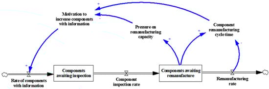 Two balancing feedback loops are of interest. When components with information (data) increase, the inspection time for components decreases, and the remanufacturing cycle time also decreases. When cycle time decreases, management is motivated to further increase the components with information, seeing it as a benefit to be reinforced, R1. When components with information increases, the number of components for remanufacturing also increases. This puts pressure on existing capacity, encouraging management to reduce the components with information so as not to overload the system, B1. Both feedback loops are in conflict. The CLD representing the two key feedback loops is shown in Figure 4. We proceed to draw the stock and flow diagram (SFD) based on the causal loop diagram. Figure 5 expands the CLD into an SFD. The stock and flow diagram is used to increase the understanding of the feedback and control process of a given system [81]. The intended simulation model can be used to test various policies regarding whether the company should increase data about the components to remanufacture, on the assumption that the increased availability of information about the component means that it is more likely the component can be sent for remanufacturing and vice versa. The less that is known about the component, the less likely it will be sent in for remanufacturing.