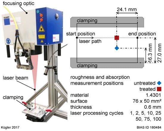Each specimen was characterized after a specific temperature treatment applied using multiple laser processing with a multi-kW laser or with an oven heating process. All experiments were conducted on ambient air. This characterization includes roughness and absorptivity measurements. For laser processing, a disc laser (Trumpf TruDisk 12002) and a programmable focusing optic (PFO 3D with a focal length of 450 mm) were used in the set-up (Figure 1, left). The maximum laser power was limited to 8 kW. Tryouts were done with a 50 mm defocused laser beam, resulting in a spot size of 3.1 mm (measured with a PRIMES FocusMonitor). The laser power was set to 250 W for all experiments with an additional linear ramping within 0.5 mm at the beginning and at the end of the sheet in order to avoid overheating at the edges. Laser beam travel speed was set at 90 mm/s.