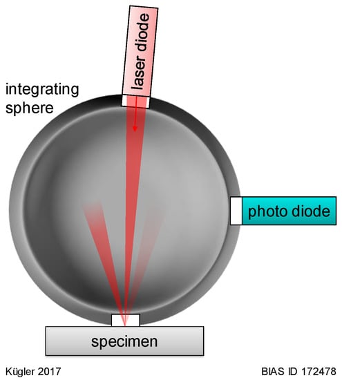 The absorptivity of each specimen was characterized using a set-up which included an integrating sphere (Ø 100 mm) with BaSO4 coating and three ports (Figure 2). The specimen irradiation was carried out using a 300 mW laser diode (Lumics LU1030M300) with a wavelength of 1030 nm which was connected to the sphere with a Thorlabs CFC-2X-B collimator (focal length = 2 mm). Reflected radiation was measured with a Si-photodiode (Thorlabs FDS100, rise time = 10 ns). Due to the highly diffuse reflective coating of the sphere, this radiation is assumed to be homogenized and therefore measurements of the photodiode are considered to be representative. This system was calibrated by measuring an Nd:YAG mirror (Thorlabs NB07-K14). According to its datasheet, the reflectance of the unpolarized laser radiation with a wavelength of 1030 nm and an irradiation angle of 8° was 99.89369%. The measurements of the mirror were set to this value. All absorption measurements were conducted on samples at room temperature.