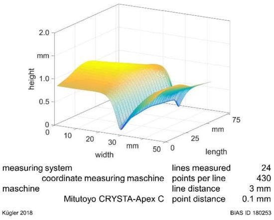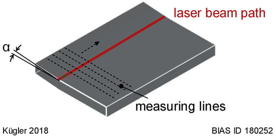 Specimens were clamped on both sides along the laser beam path. Nevertheless, distortion could occur due to residual stresses. Therefore, the deformations of the specimens were measured after laser processing. With a coordinate measuring machine (Mitutoyo CRYSTA-Apex C) 24 lines transversal to the laser beam path were recorded. Each line consisted of 432 points. These points were used to calculate a surface profile with MATLAB R2016a. In order to have comparable and characteristic values for each specimen, a mean distortion angle was calculated (Figure 3). The angle was calculated as the mean value out of 6 lines in the middle of the sheet. Thus, the measuring field consisted of 246 measuring points on an area of 4 mm × 15 mm (2 mm to each side of the laser beam path and 15 mm along the laser beam path).