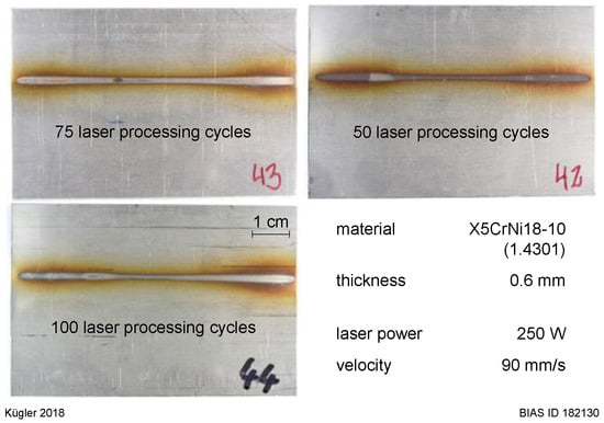 Laser processing was carried out in varying amounts of irradiation cycles in order to generate the different temperature treatments of the steel sheet surface. The chosen amounts of cycles were 1, 2, 5, 10, 25, 50, 75, and 100. These laser processing cycles were executed in two modes. In the first mode, every new laser processing cycle starts directly after the previous one. In the second mode, a waiting time of 5 seconds was implemented after each cycle before the next laser processing cycle started. Every parameter set was carried out three times in order to obtain average values and standard deviations.