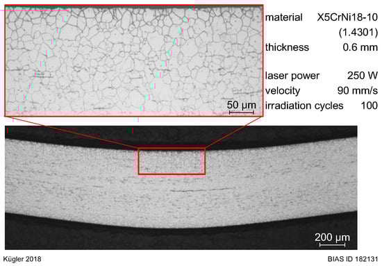 Multiple laser processing of a steel sheet resulted in a clearly visible color change which is attributed to oxidation (Figure 4). No ablation was observed in these experiments. Although specimens were clamped on both sides of the laser beam path, distortion occurred due to multiple laser processing. This distortion after laser processing could also be recognized in cross sections (Figure 5). However, microstructural changes could not be identified.