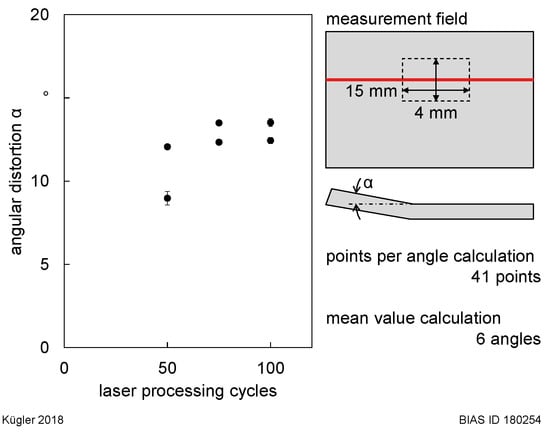 Measurements clearly show an angular distortion along the laser beam path (Figure 6). Apart from one sheet with 50 laser processing cycles, angular distortion is nearly constant for up to 100 processing cycles (Figure 7).