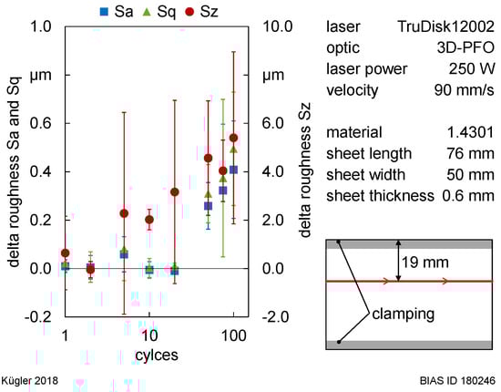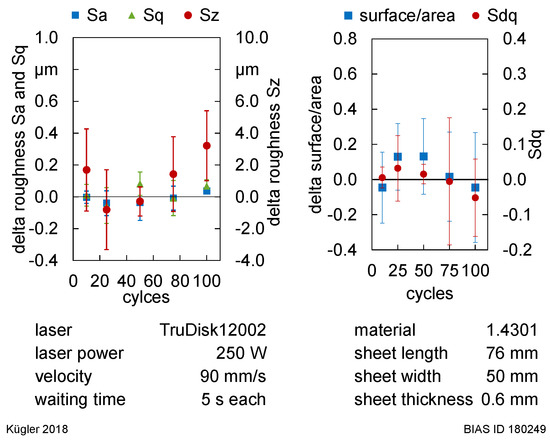 Mean roughness values Sa and Sq stay constant with respect to their standard deviations. The maximum surface height Sz is increased up to 3.2 µm for 100 laser processing cycles but simultaneously shows a high deviation (Figure 11, left). Contrary to the slightly increasing roughness values, the topography factor surface/area and the hybrid roughness value Sdq are rather constant (Figure 11, right).