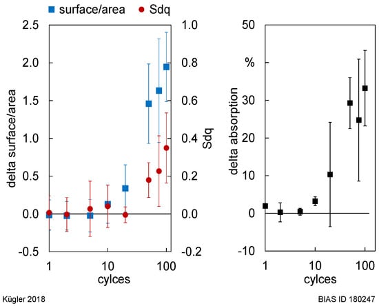 Enhanced roughness values result in an enlarged surface. This can be shown by the topography factor, surface/area. The surfaces of the measured specimens are nearly doubled with respect to constant measuring area (Figure 9, left). The hybrid roughness value Sdq shows comparable behavior (Figure 9, left). Simultaneously, absorption values increase up to 33.2% for increasing laser processing cycles (Figure 9, right).
