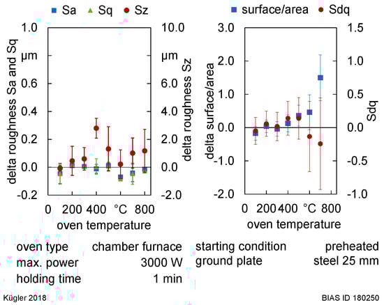 Similar to the specimens with waiting times between laser processing cycles, roughness changes of the oven heated specimens are negligible (Figure 12, left). Only for the temperature of 400 °C is the maximum surface height Sz increased to 2.8 µm. Mean roughness values Sa and Sq stay nearly constant in temperature ranges of 20 °C–800 °C. However, the topography factor surface/area shows a different behavior when oven heating is carried out (Figure 12, right). Contrary to laser processing, the roughness values Sdq point out a different tendency of the topography factor surface/area. However, high standard deviations are conspicuous for high temperatures of 600 °C and above (Figure 12, right).