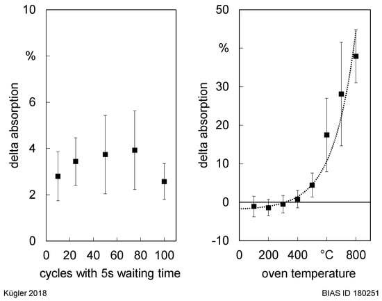 Although roughness values of specimens with multiple laser processing and waiting times of 5 s are negligible, absorption values are on average 3.3% higher than the initial state absorption values (Figure 13, left). The results do not show a clear influence of the amount of laser processing cycles when a 5 s waiting time is applied. However, in contrast to the 5 s waiting time specimens, absorption values are increased by oven heating. With increasing temperature, the absorption value is increased in a more than proportional way (Figure 13, right).
