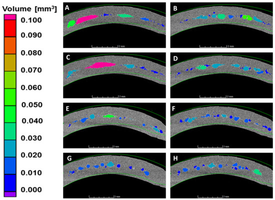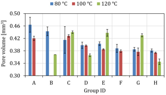 The surface determination-based porosity module was used for the void volume analysis in the VGStudioMax 3.0. The quantitative results of the void volume are presented in Figure 3; the plot shows the mean values of the total pore volume and the standard deviations.