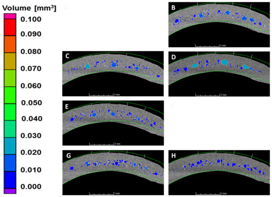 The lower pore volume corresponds to better internal quality of the component. As can been seen in Figure 3, the process settings yield the maximum void volume and the process settings yield the minimum void volume; eventually, that corresponds to all four factors at their lowest level and highest level, respectively. At 80 °C and 100 °C mold temperature, a decreasing trend in the pore volume is observed when going from setting A to H. However, this decreasing trend becomes irregular at 120 °C mold temperature, which shows the effect of packing pressure; the lower packing pressure of 625 bar results in considerably higher pore volume than that of 1000 bar. Moreover, the pores are distributed mainly along the central symmetrical plane (parting plane) of the part and individual pore volume ranges from 0.010 mm to 0.10 mm. This pattern of pore distribution can be attributed to the fact that the material around the central plane is the last to solidify and, therefore, it is more prone to air/gas entrapment and/or differential shrinkage.