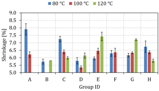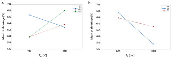 Regarding the shrinkage, the first-order interactions between melt temperature and mold temperature () and packing pressure and melt temperature () were significant as presented in Figure 10a,b, respectively. In particular, the combination of higher mold temperatures (100 and 120 °C) with lower melt temperature resulted in the lowest shrinkage of molded parts. Increasing the melt temperature to 210 °C increases the shrinkage (13%) considerably at 120 °C mold temperature. Moreover, the low melt temperature and high packing pressure exhibits a reduction of around 15% in the volumetric shrinkage of the part.