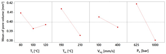 The main effect plots for pore volume are shown in Figure 7. It can be seen that the greatest effect on the pore volume is of packing pressure followed by effect of melt temperature. Increasing packing pressure from 625 to 1000 bar reduced the void content by around 10%. Indeed, higher pressure helps in removing the trapped air inside and densifies the melt. A reduction (−4.8%) in the pore volume is also observed when increasing the melt temperature from 190 to 210 °C. The effect, with respect to injection speed and mold temperature, is around 2% each, which is negligible as compared to other effects.