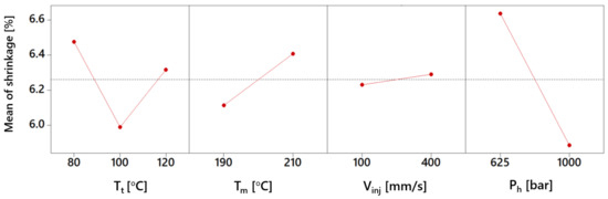 Figure 8 contains the main plots for shrinkage. The shrinkage is significantly affected by the packing pressure; increasing packing pressure from 625 to 1000 bar reduces the shrinkage considerably (ca. 10%). This reduction can be due to the fact that increasing packing pressure increases the amount of material entering the cavity; as a result, shrinkage decreases. Increasing mold temperature from 80 to 100 °C is resulted in a reduction of shrinkage; but increasing mold temperature to 120 °C shows an increment. This complex effect could be related to the crystallinity of the POM polymer as temperature (both mold and melt temperature) are known to drive the rate of crystallization by controlling the transition from melt to solid state [9,20]. The effect of melt temperature is around 2.5% and even smaller for injection speed, thus the effects are not significant.