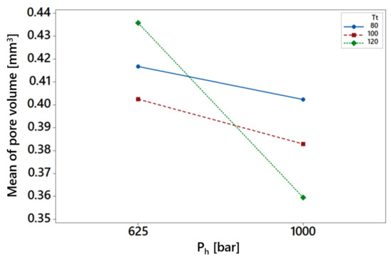 Interaction plots are used to visualize interactions among the factors; parallel lines in an interaction plot indicate no interaction, and the greater the difference in slope between the lines, the higher the degree of interaction. The significant interactions of the parameters can be identified from the p-values (<0.05) reported in Table 5, which are also discussed here in detail. Although no significant interactions are identified for pore volume, the interaction between mold temperature and packing pressure (with p-value = 0.053) seems to be slightly significant as visible in Figure 9. There seems to be no interaction up to mold temperature 100 °C; but increasing the mold temperature to 120 °C with combination of higher packing pressure lowers the pore volume considerably.