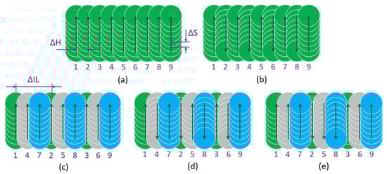 Illustration of different laser beam scanning methods: (a) unidirectional sequential, (b) bidirectional sequential, (c) unidirectional interlaced, (d) bidirectional interlaced type 1, and (e) bidirectional interlaced type 2. Meaning of symbols: ΔH—hatch distance; ΔS—distance between pulses in the laser beam scan direction; ΔIL—interlace distance.