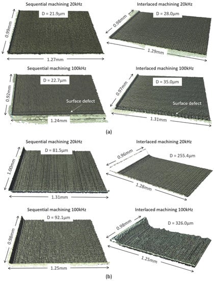 Three-dimensional (3D) profiles of the surfaces generated using two different laser beam scanning methods and two different pulse repetition frequencies (PRFs). The surfaces shown in (a) were generated using EP = 65 μJ and O = 85%, whereas those shown in (b) were generated using EP = 46 μJ and O = 95%. The profiles were measured using the Alicona surface profilometer.