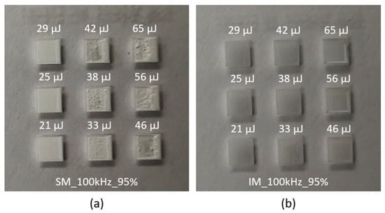 The test areas generated using SM were covered with a large amount of white powder, as can be seen in Figure 3a. Interestingly, this was not observed in the areas generated using IM, as shown in Figure 3b. The white powder, in general, consisted of glass particles (debris) that were generated during the laser process, and it was more apparent in the areas machined with the PRF of 100 kHz. Following the cleaning process (described in Section 3.3), some machined areas were still contaminated, in particular the corners.
