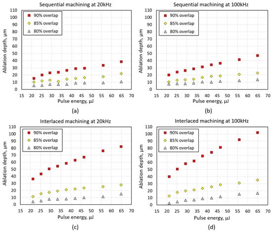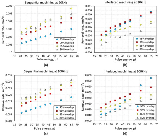 Removal rate calculated for different pulse energies and pulse overlaps. Results are presented for (a) sequential machining using PRF = 20 kHz, (b) interlaced machining using PRF = 20 kHz, (c) sequential machining using PRF = 100 kHz, and (d) interlaced machining using PRF = 100 kHz.