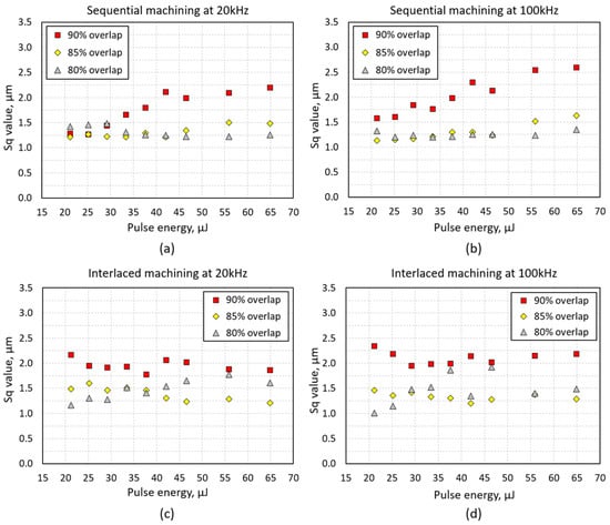 Root-mean-square (RMS) surface roughness (Sq) measured for different values of pulse energy and pulse overlap. Results are presented for two different laser beam scanning methods and two PRF values.