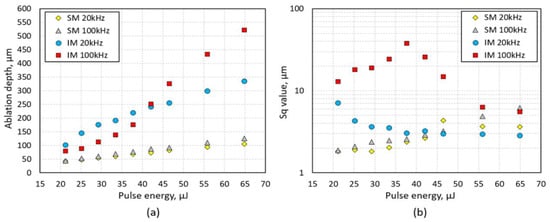 Figure 6 shows the results obtained with O = 95%. As can be seen in Figure 6a, SM provided removal of quite thick layers of glass of up to 105 µm when PRF = 20 kHz, and of up to 125 µm when PRF = 100 kHz. The Sq value of the areas generated using this scanning method was within the range of 1.8 µm to 6.2 µm, as shown in Figure 6b.