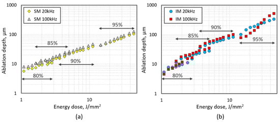 In the case of SM, the ablation depth increased almost linearly with increasing EDOSE, as can be seen in Figure 7a. This increase was very similar for both values of PRF (20 kHz and 100 kHz) and constant for all values of the pulse overlap. IM, meanwhile, led to slightly different results, as shown in Figure 7b. Although the ablation depth increased with increasing EDOSE, this increase did not follow the same overall linear trend. The linear increase was only seen locally, i.e., for individual values of O ≤ 90%. In the case of O = 95%, the ablation depth increased in a non-linear manner.