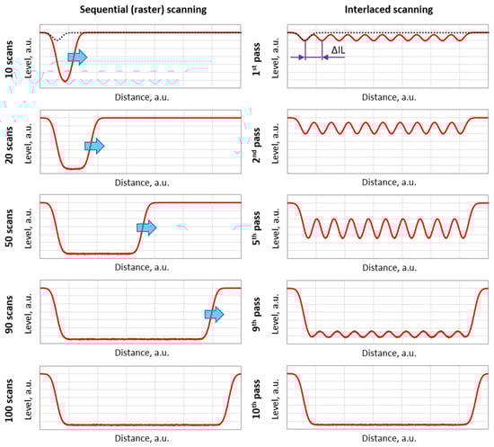 Figure 9 illustrates the cross-section of areas generated at various stages of processing. In the case of SM, a constant depth was obtained after several laser scans, when the lateral translation of the laser beam was ≥2ω relative to its starting position. In the case of IM, in contrast, the depth of the machined area increased gradually, i.e., the material was removed layer by layer, following each complete pass of the laser beam. This simple model indicates that both laser beam scanning methods should remove the same volume of material provided that the total number of laser scans in both scanning methods is the same; however, this was not observed experimentally. More importantly, the model demonstrates that the surface topology generated by IM should undergo significant changes between laser passes. Hence, we performed a simple experiment in which the interlaced laser machining was interrupted between subsequent laser passes and the topography of the machined areas was analyzed using the Alicona surface profilometer. In this way, the ablation depth and surface roughness (Sq) were measured and compared with the simulation results. The experiment was performed only for one set of laser machining parameters (i.e., EP = 46.5 µJ, PRF = 20 kHz, O = 90%, and ΔIL = 24 µm), which corresponds roughly to the midpoint on the graphs of Figure 7. The results of this experiment are presented in Figure 10.