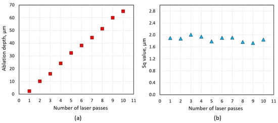 (a) Ablation depth and (b) surface roughness of the areas generated during interlaced machining using the following laser machining parameters: EP = 46.5 µJ, PRF = 20 kHz, O = 90%, and ΔIL = 24 µm.