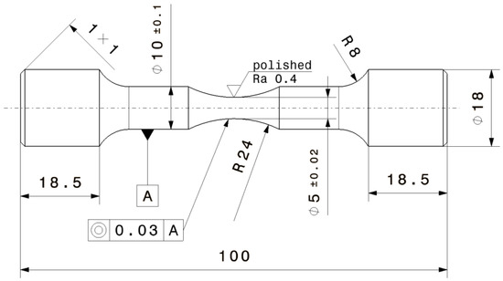 Specimens were fabricated using an EOS M290 system with a Yb fiber laser, a power of 400 W, and a beam diameter of 100 µm. All specimens were built in the vertical direction with a certain machining allowance in order to remove subsequently the as-built surface and eliminate surface-related effects. The structures were manufactured according to the standard parameter set given by the system and powder manufacturer EOS. Following the built process, hot isostatic pressing was performed applying a temperature higher than 500 °C and a pressure of above 100 MPa with a holding time of at least two hours followed by quenching under constant pressure. Low temperature annealing over a certain time period was conducted afterwards. Subsequent to the heat treatment, the specimens were processed to the final geometry by turning and polishing. A CAD drawing with the detailed specimen geometry and dimensions is shown in Figure 1. The shape of the specimens was designed to show a homogeneous stress distribution over the cross-section with a stress concentration factor as low as possible due to the narrowing within the testing section, corresponding to no common standard.