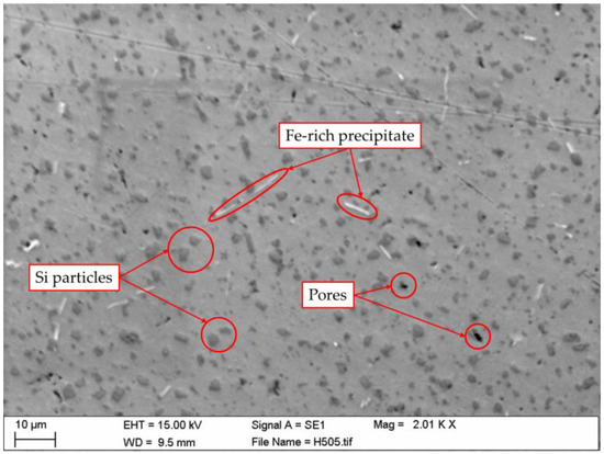 HIP treatment at high temperature with considerably high pressure leads to significant microstructural differences compared to the as-built condition; hence, the effect on the material was investigated in detail. To characterize the microstructure after HIP and heat treatment, SEM images, taken with a Carl Zeiss EVO MA 15 microscope, of the post-processed condition were evaluated. In Figure 2, one can clearly see Fe-rich precipitates and Si particles, which were also detected in [21]. Silicon crystals were precipitated at the grain boundaries during the HIP treatment above the solubility temperature, and they grew to their respective size during low temperature annealing [22,23,24,25]. Microstructural features like silicon agglomerations and needle-shaped, Fe-rich precipitates obstructed a propagating fatigue crack and, therefore, generally improved the resistance against fatigue crack growth. Such microstructures favor crack deflection and energy dissipation at the crack tip. Hence, the long crack growth was decelerated, whereby the fatigue strength was enhanced [17,26].