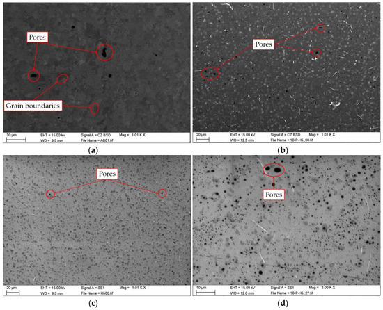 Comparing the microstructure of the as-built condition (Figure 3a) to the microstructure after the post-treatment (Figure 3b,c), appreciable differences regarding the porosity we observed. For that reason, these figures have the same magnification and scale. A larger magnification image is depictured in Figure 3d, which reveals a circular shape of the observed micro-porosity. One can see that the amount of porosity and the maximum extension of pores have significantly decreased. Additionally, after the post-treatment, melt-pool boundaries completely vanished. The aforementioned Fe-rich precipitates and Si-crystals were formed within the microstructure. Throughout the annealing, the Si-particles grew at Si-rich cellular boundaries, and finally, grain boundaries were no longer clearly visible at this stage due to the heat influence [23]. The comparison between backscatter images before (Figure 3a) and after (Figure 3b) HIP treatment highlights this microstructural change.