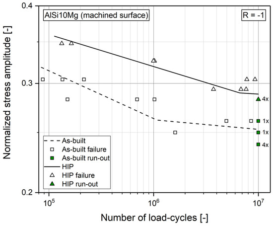 The fatigue test results are presented in Figure 4. The dashed line with square marks represents the data for the as-built series. The full line with triangle markings shows the data for the HIP condition. Within the finite life region, the specimen was tested at several load levels with a certain incrementation. The evaluation of the SN-curve in the finite life region is based on the ASTM E739 standard [27]. The high cycle fatigue strength at 1 × 107 load-cycles was statistically evaluated by applying the arcsin√P-transformation procedure given in [28]. Run-outs were reinserted at higher stress levels in order to obtain additional data within the finite life region. The results were normalized to the nominal ultimate tensile strength (UTS) of the additively-manufactured material without any post-treatment, given by the powder manufacturer [29]. The peak load level was set at about 35% of the UTS, which was well below the yield strength according to the powder manufacturer, to ensure testing within the linear-elastic region of the material and obtain reasonable results regarding endured load cycles. The results revealed that the HIP test series provided an increase of the high cycle fatigue strength of about 14% considering a survival probability of PS = 50%. The scatter band between 10% and 90% survival probability, referring to the stress amplitude, minorly decreased for the HIP condition compared to the as-built condition. Furthermore, the slope in the finite life region was less steep for the HIP condition. The fatigue test results are summarized in Table 2.
