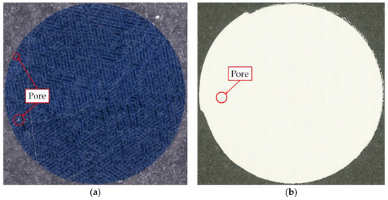 In order to evaluate the decrease in porosity, the average maximum pore extension, as well as the equivalent circle pore diameter, several micrographs of the two conditions were investigated. Figure 5a shows an example of the as-built condition, whereas Figure 5b is taken from the microsection of an HIP-treated specimen. All pictures of micrographs and fracture surfaces were recorded with a KEYENCE VHX-5000 light optical digital microscope. The microsections were prepared only by polishing and received no additional etching. Dependent on the polished surface and the image post-processing, different lighting options and angles were necessary. This was the reason why the as-built specimen in Figure 5a (ring-lighting) appears blue and shows a different texture, e.g., visible melting tracks and laser scanning strategy, than the HIP sample in Figure 5b (coaxial lighting). In order to determine the amount of porosity, image processing tools were utilized. At first, the images were converted to binary pictures with a certain threshold to ensure that the microsection of the specimen area appeared white while pores appeared black. Secondly, the embedding material was subtracted from the image. In the end, the separated pores, as well as the porosity, which is the ratio of specimen area to pore area, could easily be evaluated. The outcome is presented in Figure 6a–c and summarized in Table 3. The results were again normalized to the as-built condition to highlight the differences between the two test series. The results maintained that the HIP samples possessed a significant lower level of porosity (−64%), a decreased maximum pore extension (−22%), as well as an equivalent circle diameter (−11%).