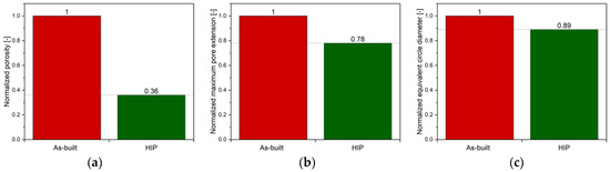 Difference in (a) porosity, (b) maximum pore extension, and (c) equivalent circle pore diameter between the as-built and HIP series.