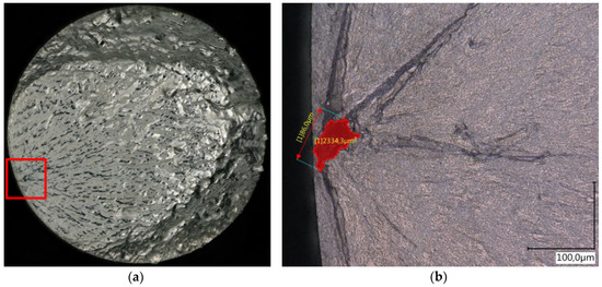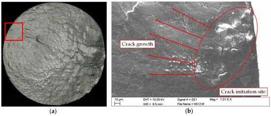 To characterize the crack-initiating defect, a fracture surface analysis for each tested specimen was carried out. A fractured surface of the as-built specimen is presented in Figure 7a. The surface is visually differentiated into two sections, the oscillating crack growth regime and the burst fractured area. The defect, which was responsible for the failure, can be easily identified and evaluated. In every investigated fractured surface for the as-built condition, a pore was failure critical. An example with a marked and measured pore is given in Figure 7b. The size and location of the failure causing imperfection was one determining factor for the fatigue strength of the material; see also [30,31]. Therefore, an evaluation of the defect size was necessary to compare and to assess the fatigue strength of the two investigated conditions.