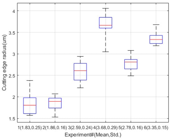 The cutting edge radius of the tool used in the previous experiment was measured by using a microscope (Olympus MX50) and by applying an image processing algorithm to calculate the corresponding MCT and the corresponding critical feedrate. The cutting edge radius measurements were then used in a simulation of chip production rate. Ten measurements were made from each cutting edge image from Exp. 1 to 6 and the means and the standard deviations are obtained as shown in Figure 1.