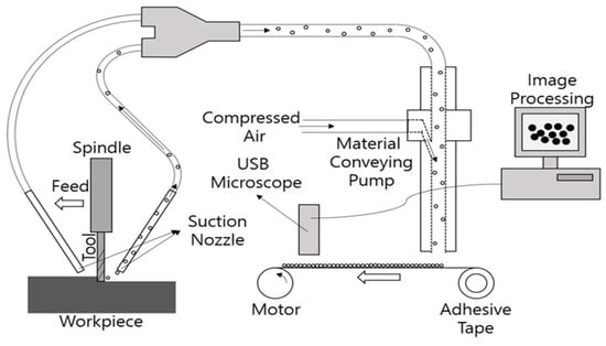 A schematic diagram of the experimental setup is shown in Figure 2. Six sets of cutting tests were performed with a 2-flute 200 μm endmill and brass workpiece []. The spindle speed and the depth of cut were set to 80,000 rpm and 40 μm, respectively. The purpose of the tests was to observe the drops between the number of chips obtained when the UCT is larger than the MCT and when the UCT is smaller than the MCT. Therefore, the feedrate was increased from 1 mm/s to 6 mm/s by 1 mm/s per slot and six slots were cut in each test set. The chips were sucked during the cutting process by using a material conveying pump and blown on an adhesive tape while the tape was being unwound by a pully attached to a motor shaft. Images of the chips were taken by a USB microscope. Thirty images of the tape with chips were obtained per slot. The number of chips was determined by applying image processing to the images.