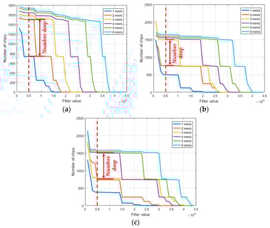 Size filtering and number of chips from the simulation with the cutting edge radius (critical feedrate) of (a) 2 (1.6 mm/s), (b) 3 (2.4 mm/s), and (c) 4 (3.2 mm/s).
