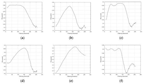 Relationship between the experimental filtering threshold and R-squared values from the linear fitting from (a) Exp. 1 to (f) Exp. 6.