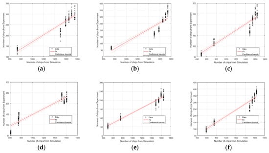 Linear fit of the number of chips from the simulation and the experiment with the optimum experimental size filtering threshold from (a) Exp. 1 to (f) Exp. 6.