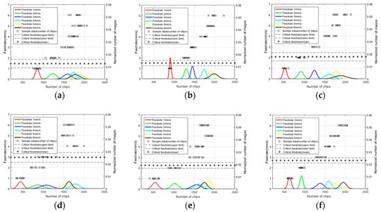 Normal distribution of the output signal and the critical feedrate boundary (Mean, Std.) from (a) Exp. 1 (1.46 mm/s, 0.196 mm/s), (b) Exp. 2 (1.49 mm/s, 0.127 mm/s), (c) Exp. 3 (2.07 mm/s, 0.188 mm/s), (d) Exp. 4 (2.94 mm/s, 0.23 mm/s), (e) Exp. 5 (2.23 mm/s, 0.132 mm/s), and (f) Exp. 6 (2.68 mm/s, 0.12 mm/s).