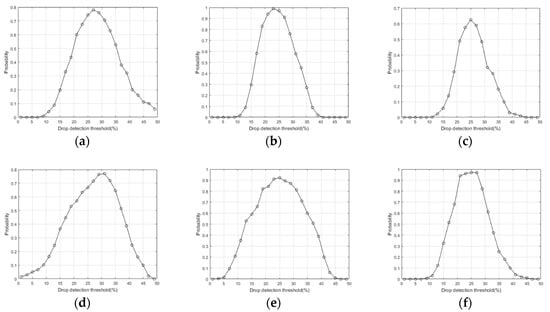 Drop detection threshold and probability of estimation from (a) Exp. 1 to (f) Exp. 6.
