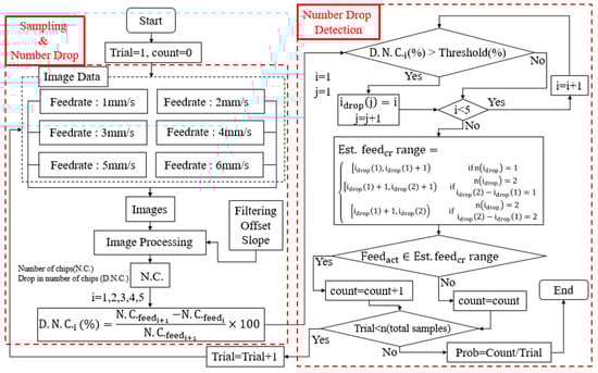We begin by proposing that the drop in the number of chips at the critical feedrate is larger than the drops that occur at other feedrates. In order to distinguish the large drop from the other small drops, a drop detection threshold is introduced. This threshold represents the decrease in the chip number in percentage. For example, when the number of chips is reduced by 20% between feedrate 3 mm/s and 2 mm/s and the other drop is 30% between feedrate 2 mm/s and 1 mm/s, the feedrate range between the feedrate of 2 mm/s and 1 mm/s is selected with the threshold of 25% as the critical feedrate range that includes the actual critical feedrate.