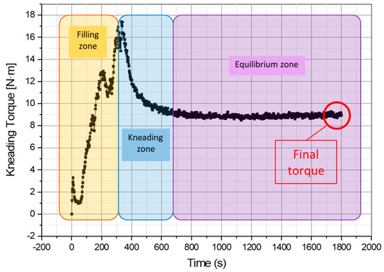 For small volumes, a laboratory compounder (W50 EHT), provided by Brabender GmbH & Co., KG and equipped with gearbox, mixer bowl, roller blades, and front plate, was used and gives the torque vs. time as a result, in which the torque displays the resistance of materials against the rotating blades during the mixing process. An example of a kneading curve with the indications of final torque and three main regions, i.e., filling zone, kneading zone, and equilibrium, is given in Figure 2. Measuring viscosity is done by using a high-pressure capillary rheometer (HPCR Rheograph 25) provided by GOETTFERT Werkstoff-Prüfmaschinen GmbH, Buchen, Germany. For this work, we used a capillary of 2 mm diameter, 25 mm active length, and 90° feeding angle. A surface area analyzer (Gemini VII 2390) from Micromeritics Instrument Corporation, Aachen, Germany, was used for Brunauer–Emmett–Teller (BET) measurements. An OCA 200 Optical contact angle measuring and contour analysis system for alumina powder and binders, and a DCAT 25SF dynamic contact angle measuring device, and tensiometer for fibers, were used to measure the contact angle. Both devices were produced by DataPhysics Instruments GmbH, Filderstadt, Germany
