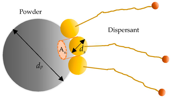 The theory by Li et al. [25] explains the calculations for the least amount of dispersant required to cover the surface area of powder particles (provided that they are spherical) by using the projected area of the dispersant as seen in Figure 3, where dp is the diameter of the powder and ds is the diameter of the dispersant.